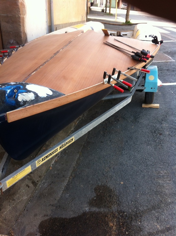aujourd'hui j'ai attaqué la pose de la deuxième couche de listons en sapelli de l'avaleur en allant vers l'arrière sur 3 mètres de long sur les deux cotés du bateau