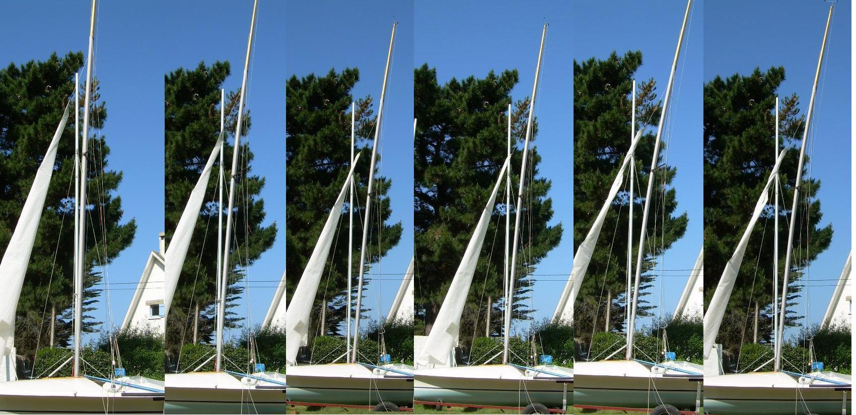 Dans la série de clips suivante, on va voir l'effet de la prise de quête sur la bascule du mât. Un mât de pavillon est placé derrière et il va permettre de juger l'effet sur le gréement des quêtes et tensions du réglage 1 au réglage 8.