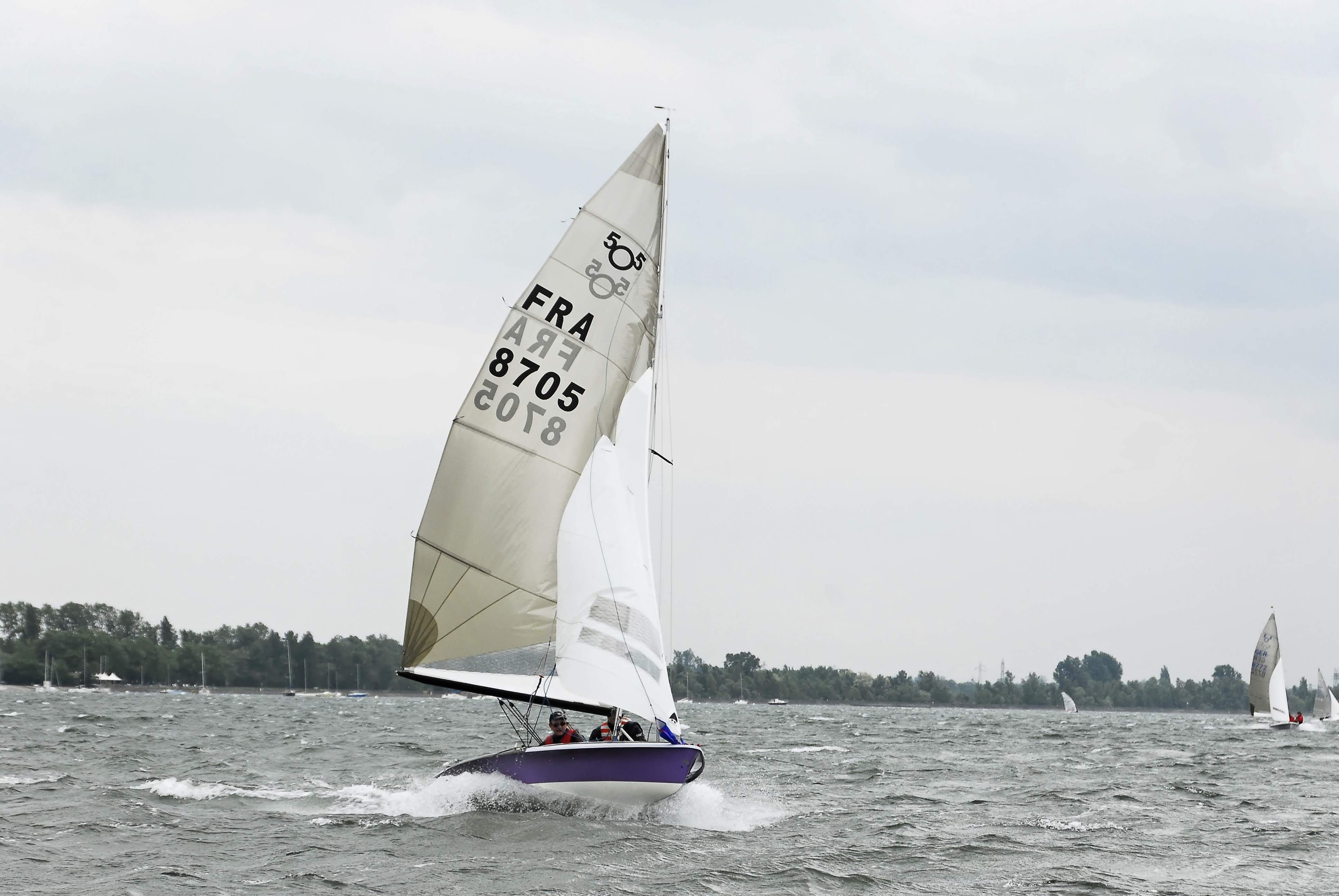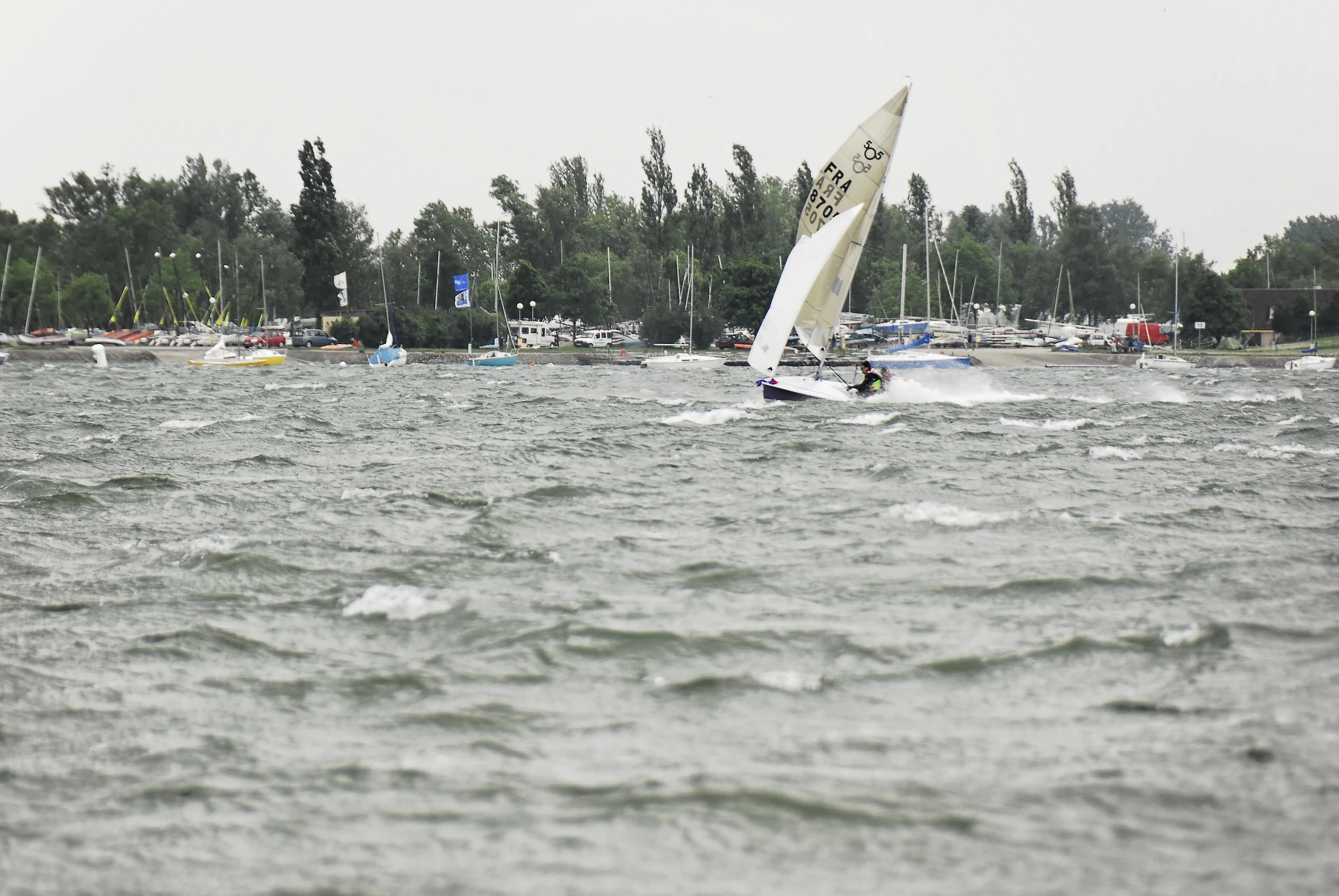 Sur cette première image, nous venons d'empanner. Observez les pavillons et l'état du plan d'eau alors que le coup de vent vient de frapper le plan d'eau.