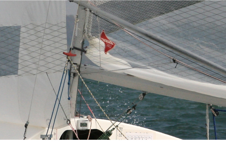 En fait ce jour là je testais des voiles que North me prêtais (Gaetan le voilier de Vannes chez North Sails). C'est le prototype, à partir d'une coupe faite par le voilier anglais qu'on a un peu vu sur le circuit (ex Speedsails) et la voile est assemblée et cousue à Vannes. Sur cette voile il n'y avait pas de poulie cousue comme sur mes voiles et je ne pouvais pas passer le cunningham sans faire une modification - du coup je ne l'ai pas mis, d'autant que les conditions plaisantes du jour ne justifiait pas de mettre le cunningham.