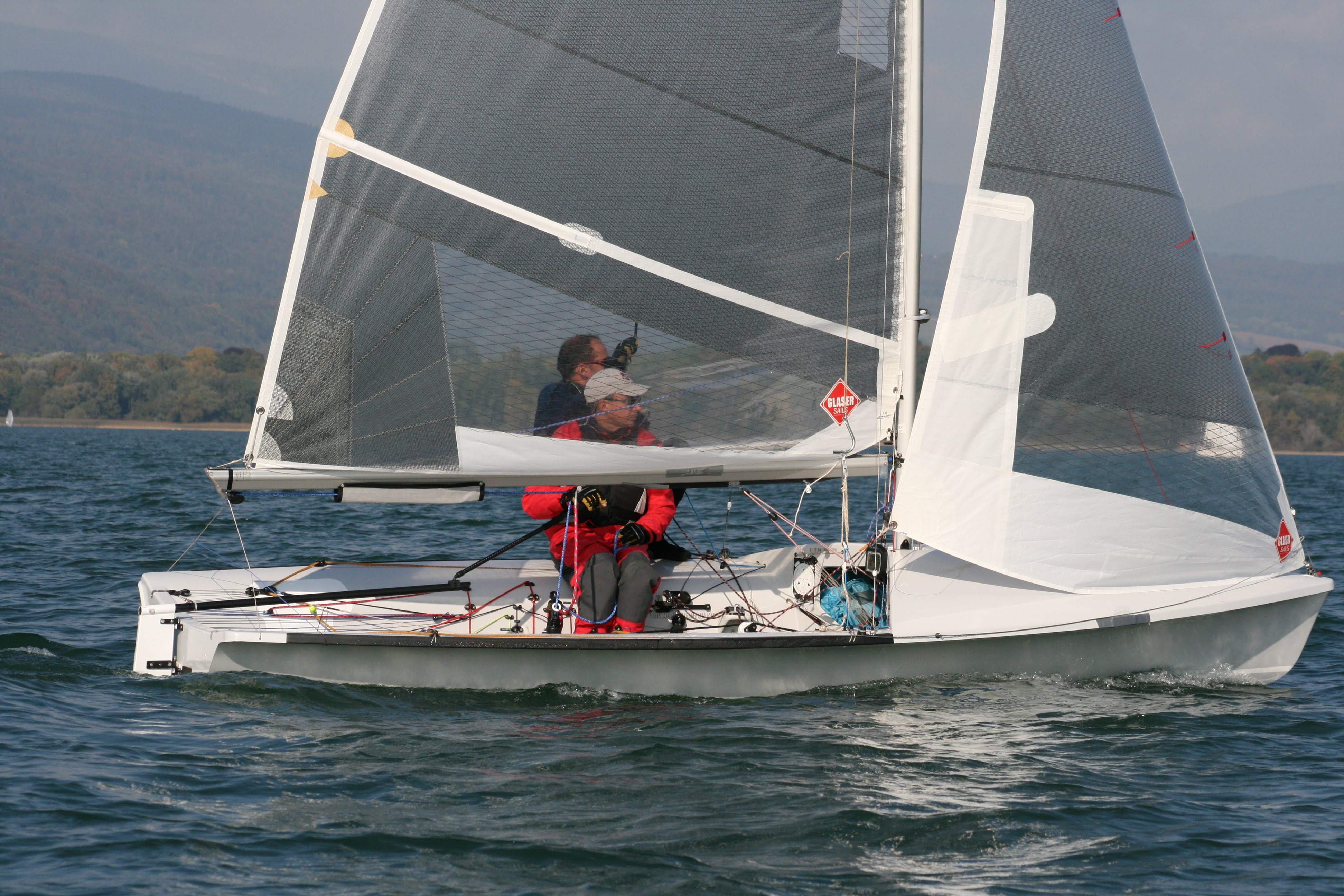 Sur cette belle image, Christian et Christian sont concentrés dans un force 2 qui a permis de lancer la 4ième manche. On les voit à travers la large fenêtre de la grand voile Glaser - très pratique pour bien voir ce qu'il se passe sur le plan d'eau sous le vent.