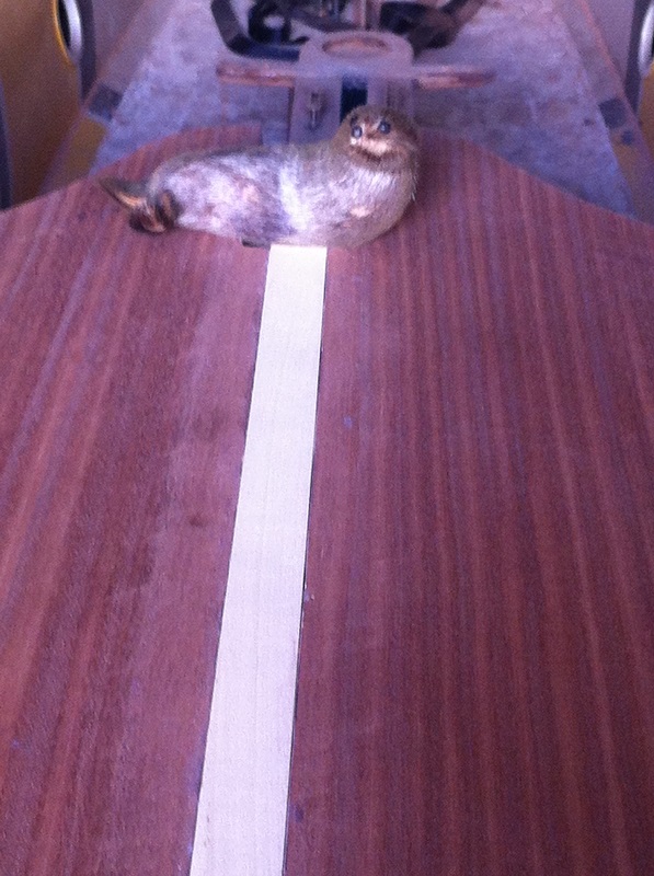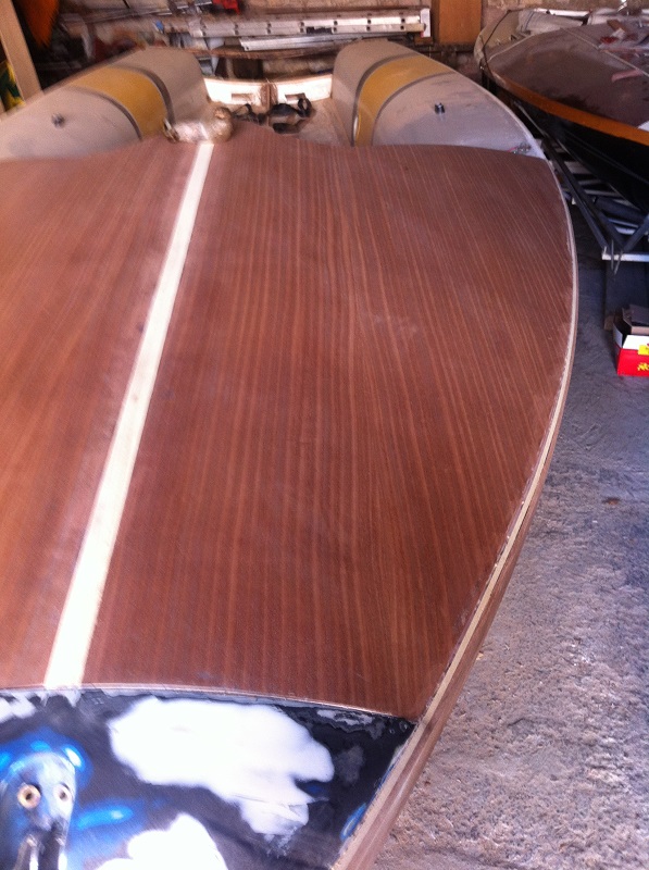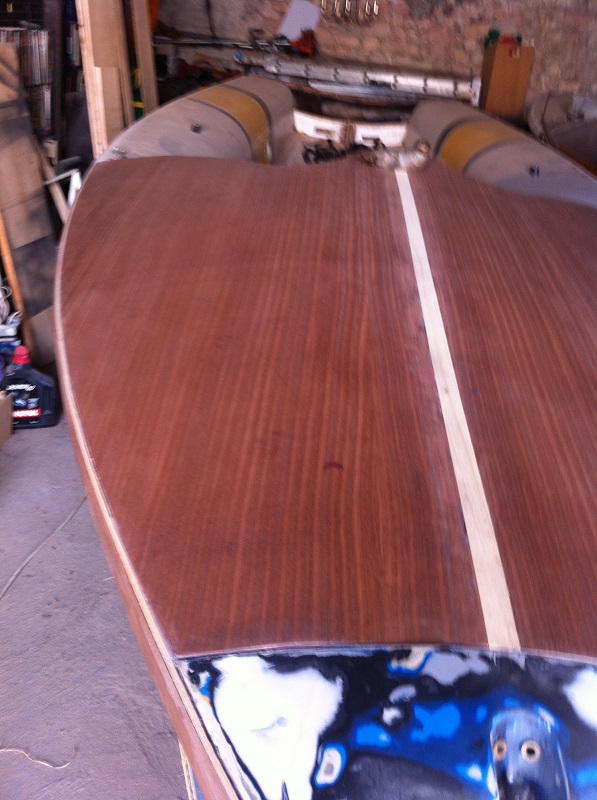aujourd'hui j'ai attaqué la pose de la deuxième couche de listons en sapelli de l'avaleur en allant vers l'arrière sur 3 mètres de long sur les deux cotés du bateau :wink: :wink: