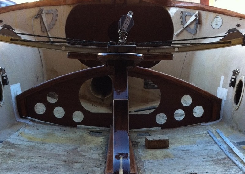 ensuite j'ai pratiquement fini de poser l'accastillage (reste 2 bricoles) et coté finitions peinture,reste l'anti dérapant des listons et un peut de travail sur le tableau arrière (poncage du mastic et peinture)avant d'installer le gouvernail