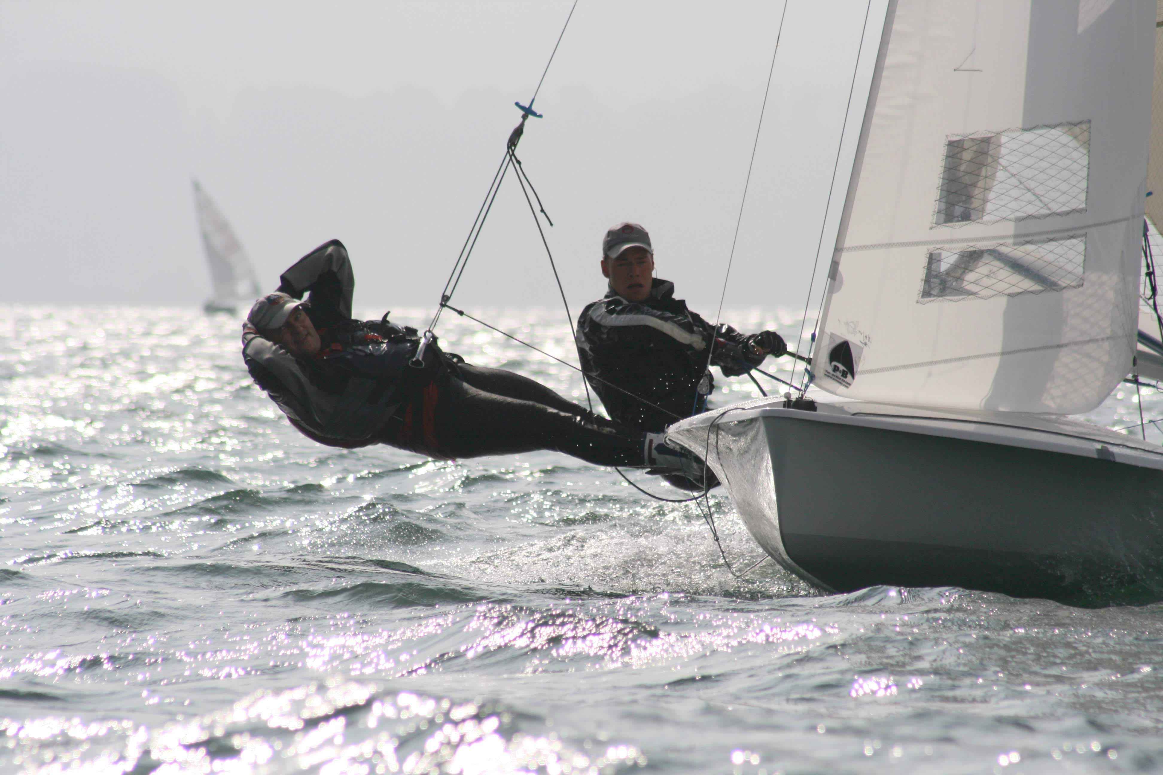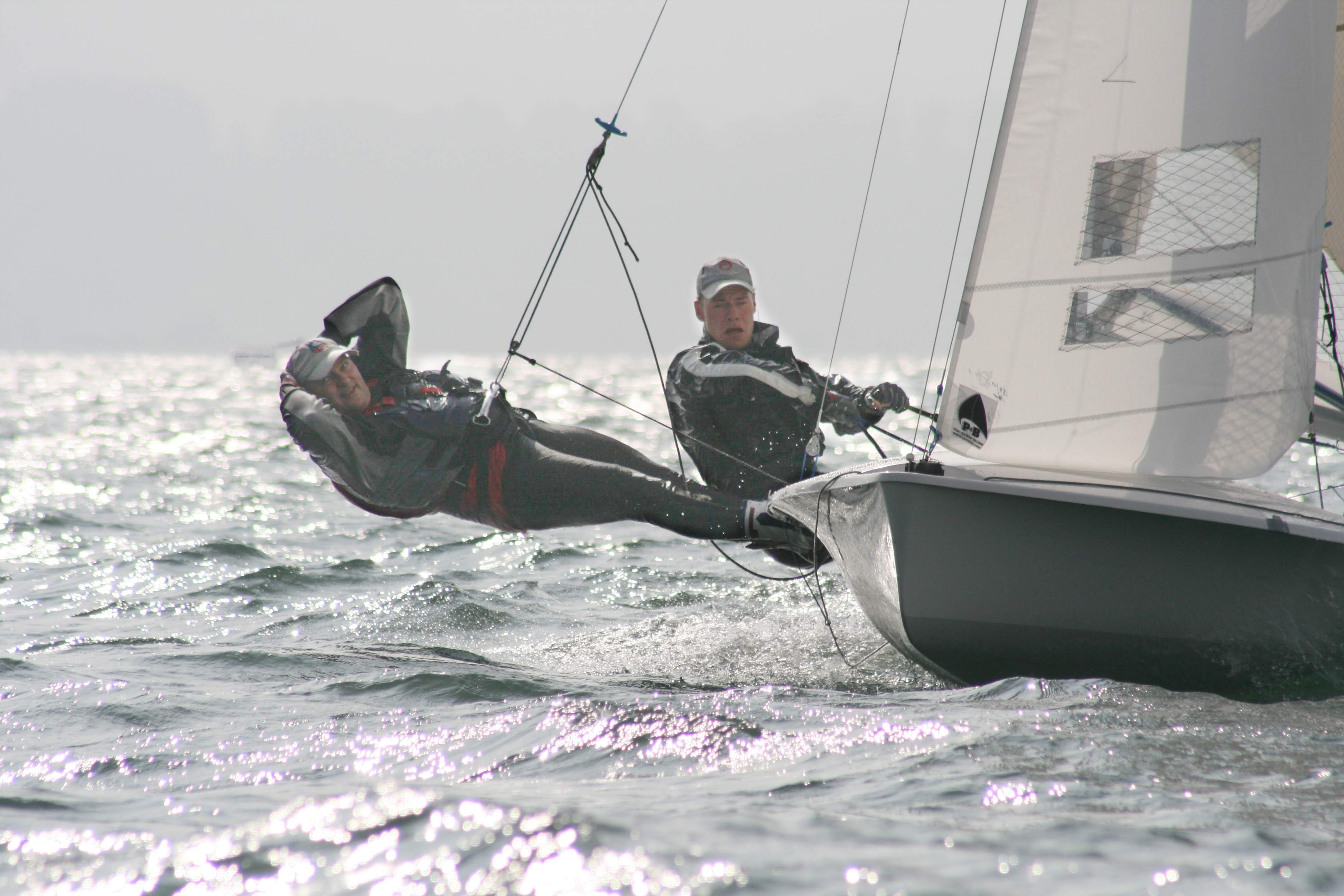 A bord de sont DUVe, le 8729, Philippe Jacot est plein trapeze et son barreur Florian maintient une assiette super au près. A plat plein trapèze, ils vont à toutes les manches finir dans les premiers très régulièrement.